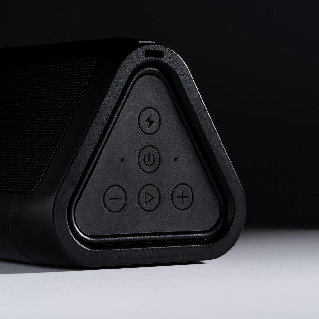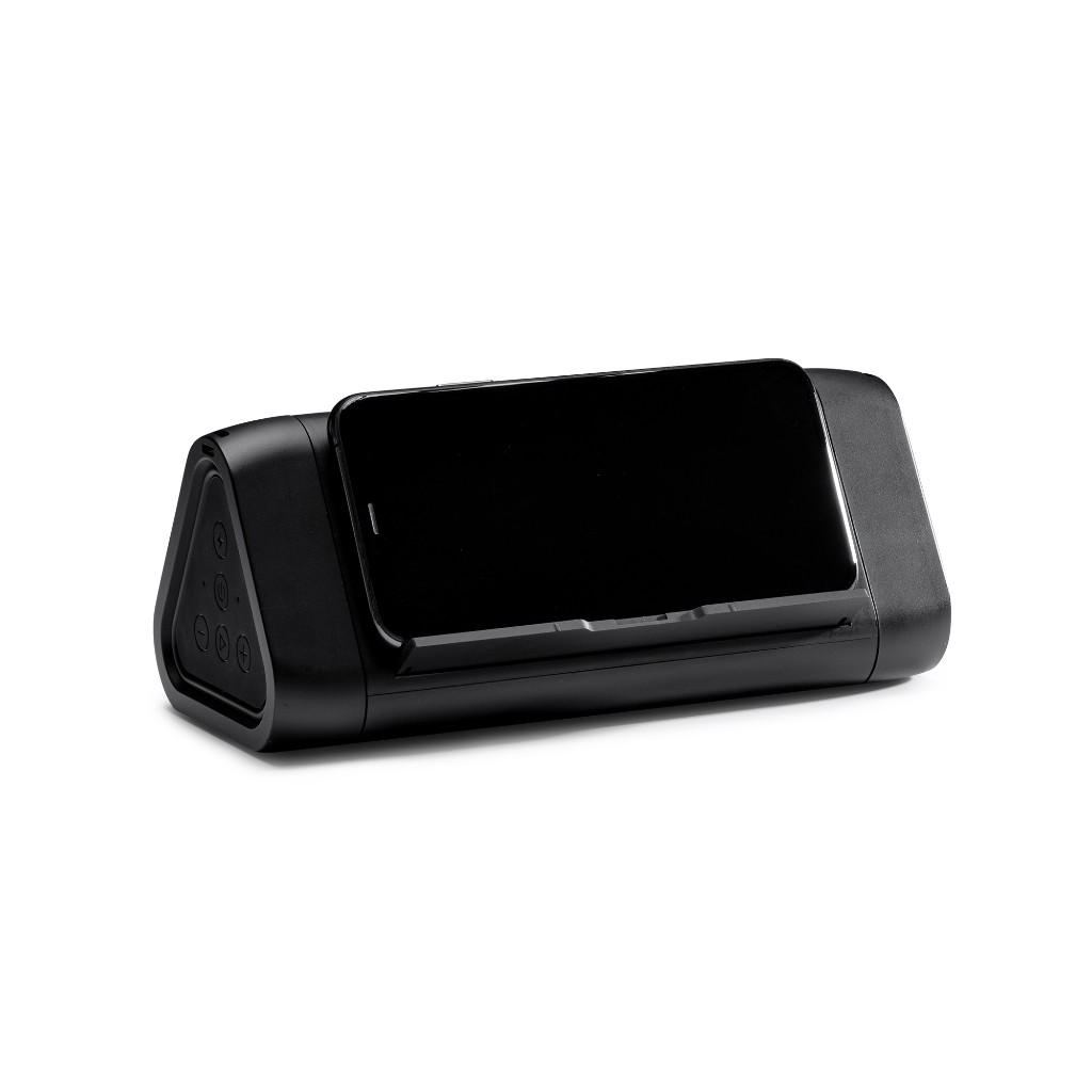 Altavoz Bluetooth realizado en material resistente al agua, con potencia de 10W. Cuenta con un tiempo de funcionamiento continuo de hasta 8 horas. Con función de carga inalámbrica de 5W para dispositivos provistos de esta tecnología y función manos libres, con botones multifunción de control de llamada y micrófono incorporado. Incluye indicador luminoso de carga y soporte para móvil en la parte posterior.