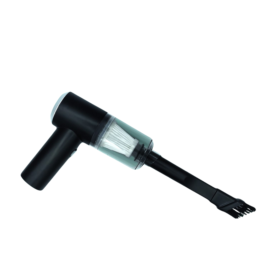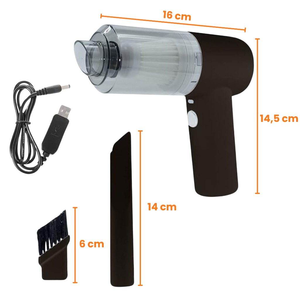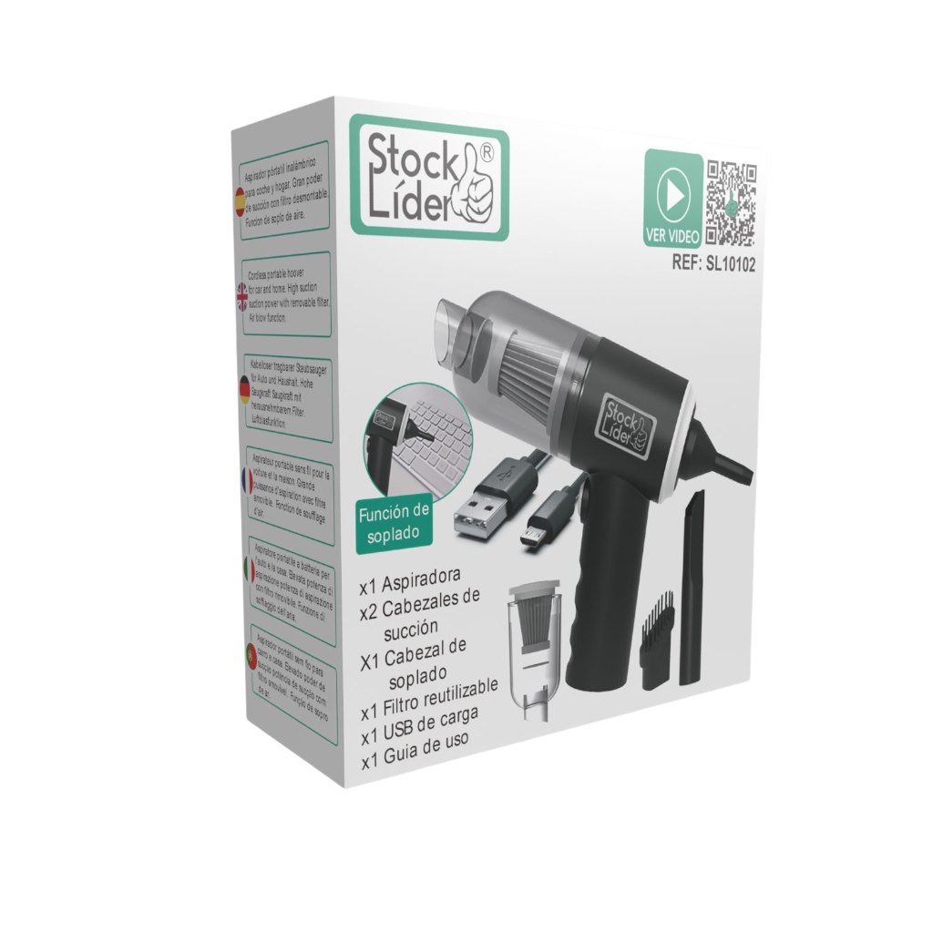 Fabricada en ABS resistente y ligero, cuenta con filtro HEPA lavable, batería recargable USB (hasta 30 min de uso) y varios accesorios intercambiables para limpiar rincones, teclados y zonas difíciles.