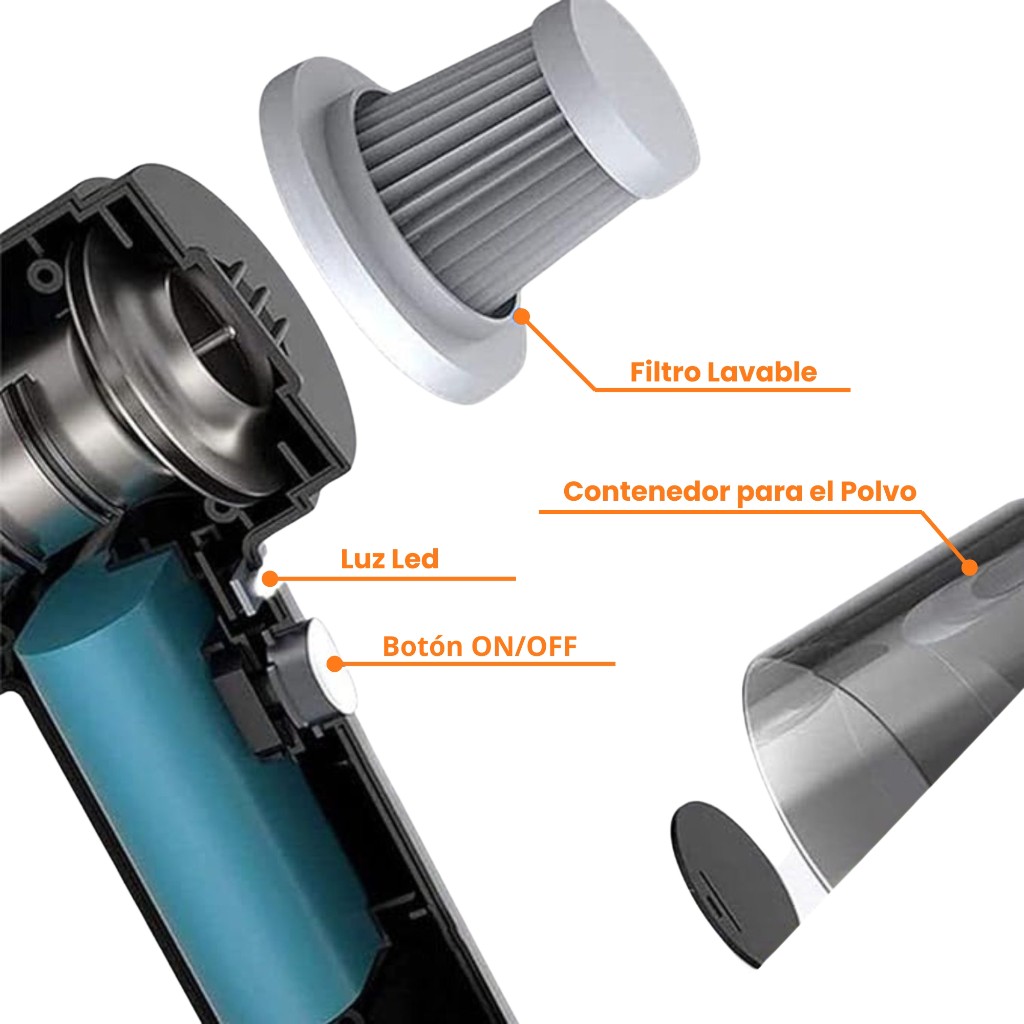 Fabricada en ABS resistente y ligero, cuenta con filtro HEPA lavable, batería recargable USB (hasta 30 min de uso) y varios accesorios intercambiables para limpiar rincones, teclados y zonas difíciles.